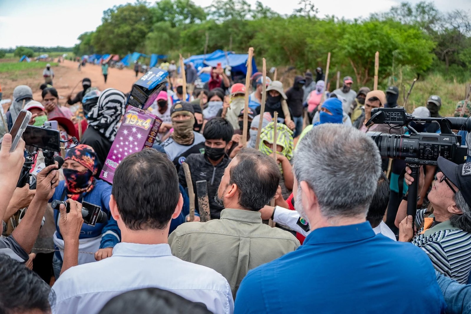 Por la tarde, llegó el gobernador de Santa Cruz, Fernando Camacho, y dirigentes cívicos que intentaron retomar el lugar entrando al predio que estaba resguardado por los movilizados que estaban con el rostro cubierto y con palos y petardos.