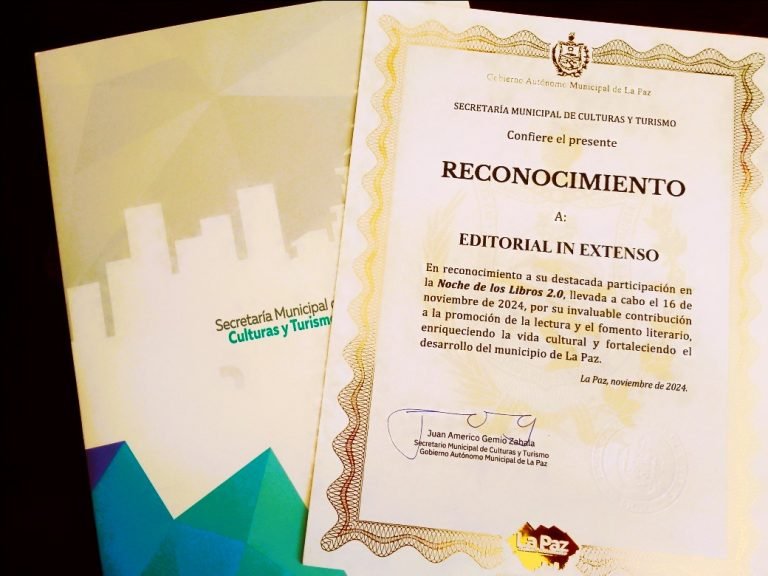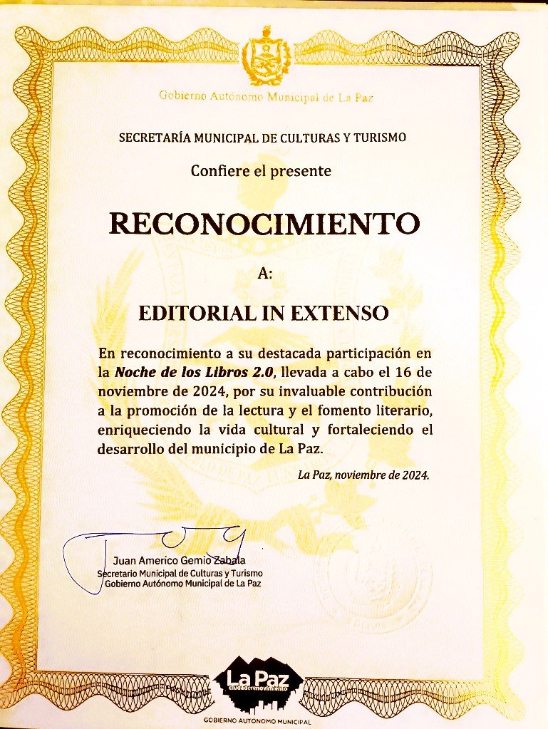 IN EXTENSO/La Paz.- La editorial Inextenso de la Prensa Asociada Nacional (PAN, fue reconocida por la Secretaría Municipal de Culturas y Turismo de La Paz, por la destacada participación en la Noche de los Libros 2.0 que se desarrolló el pasado 16 de noviembre de 2024 en la plaza Abaroa, por su invaluable contribución a la promoción de la lectura y el fomento literario, enriqueciendo la vida cultural del municipio de La Paz.
