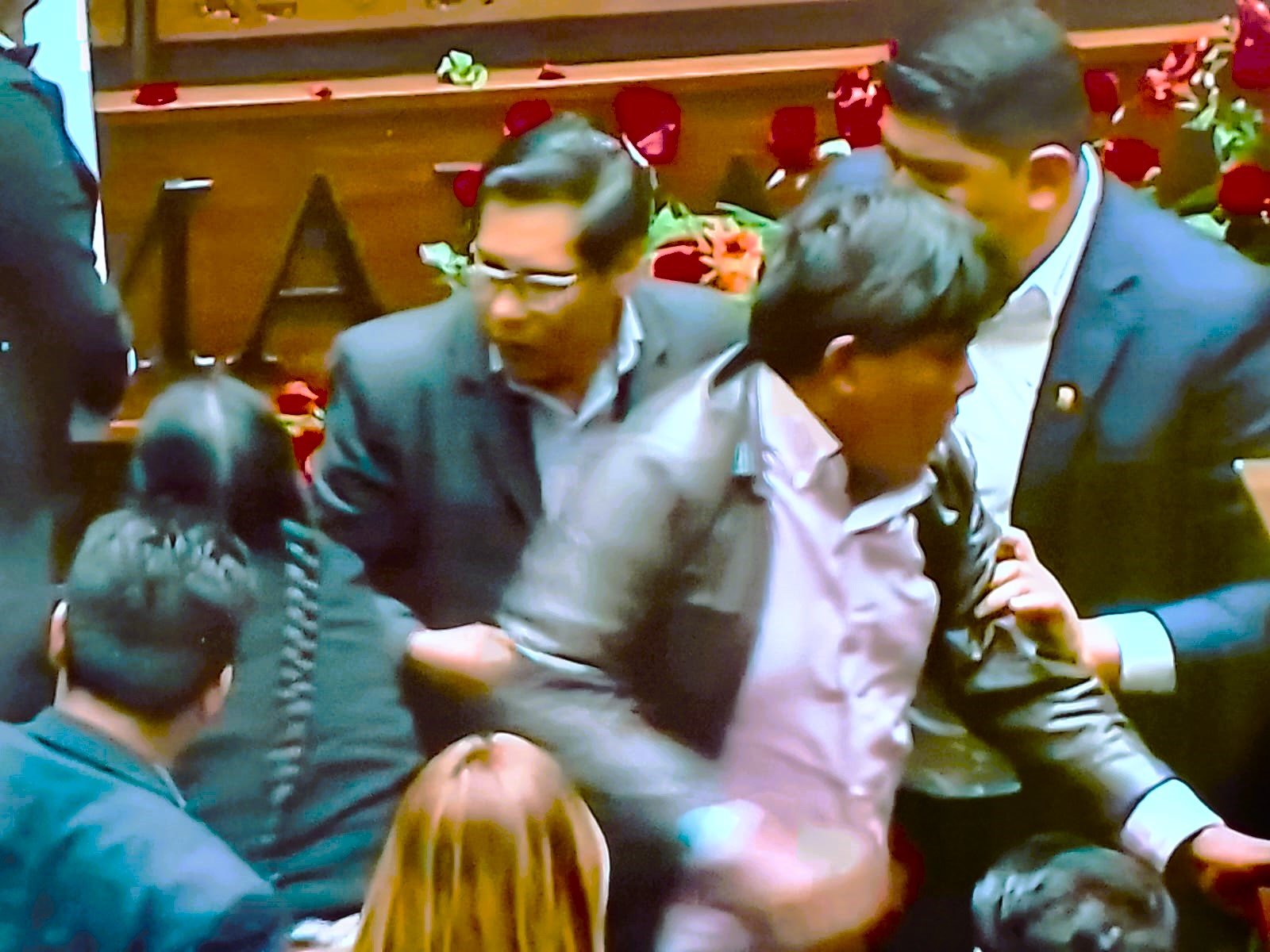 El Vicepresidente Choquehuanca fue el más afectado ya que recibió tomates, floreros, agua en la testera de la Cámara de Diputados, donde fue agredido por los seguidores de Evo Morales, en medio de los invitados e incluso corrieron riesgo un grupo de jóvenes que tenían que cantar el Himno Nacional.