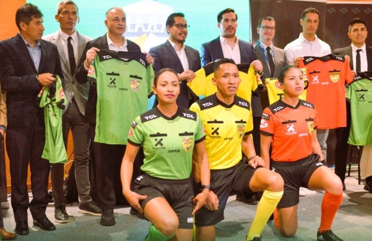D´BOLEA/ La Paz.- La Asociación Boliviana de Árbitros de Fútbol y la Federación Boliviana de Fútbol realizaron la presentación de la indumentaria de los jueces para esta temporada y esta claro que tuenen el color de la bandera nacional en homenaje al bicentenario de la fundación de Bolivia, que se cumplirá el 6 de agosto, y al centenario de la Federación Boliviana de Fútbol (FBF), que será el 12 de septiembre.