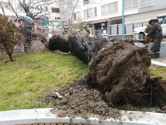 “En horas de la madrugada, debido a la constante lluvia, teníamos un arbolito de entre 50 y 60 años, el cual sufrió un desplome por causas naturales. Más del 50 por ciento de sus raíces y tronco estaban en putrefacción”, explicó Rasmussen sobre el caso en la plaza Virgen de la Candelaria, en la avenida Montenegro.