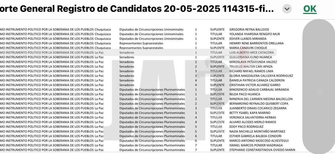 Por el momento aparece como Senador el Luis Arce Catacora. El documento es oficial del Tribunal Supremo Electoral. En la lista se ubica en el sexto puesto.