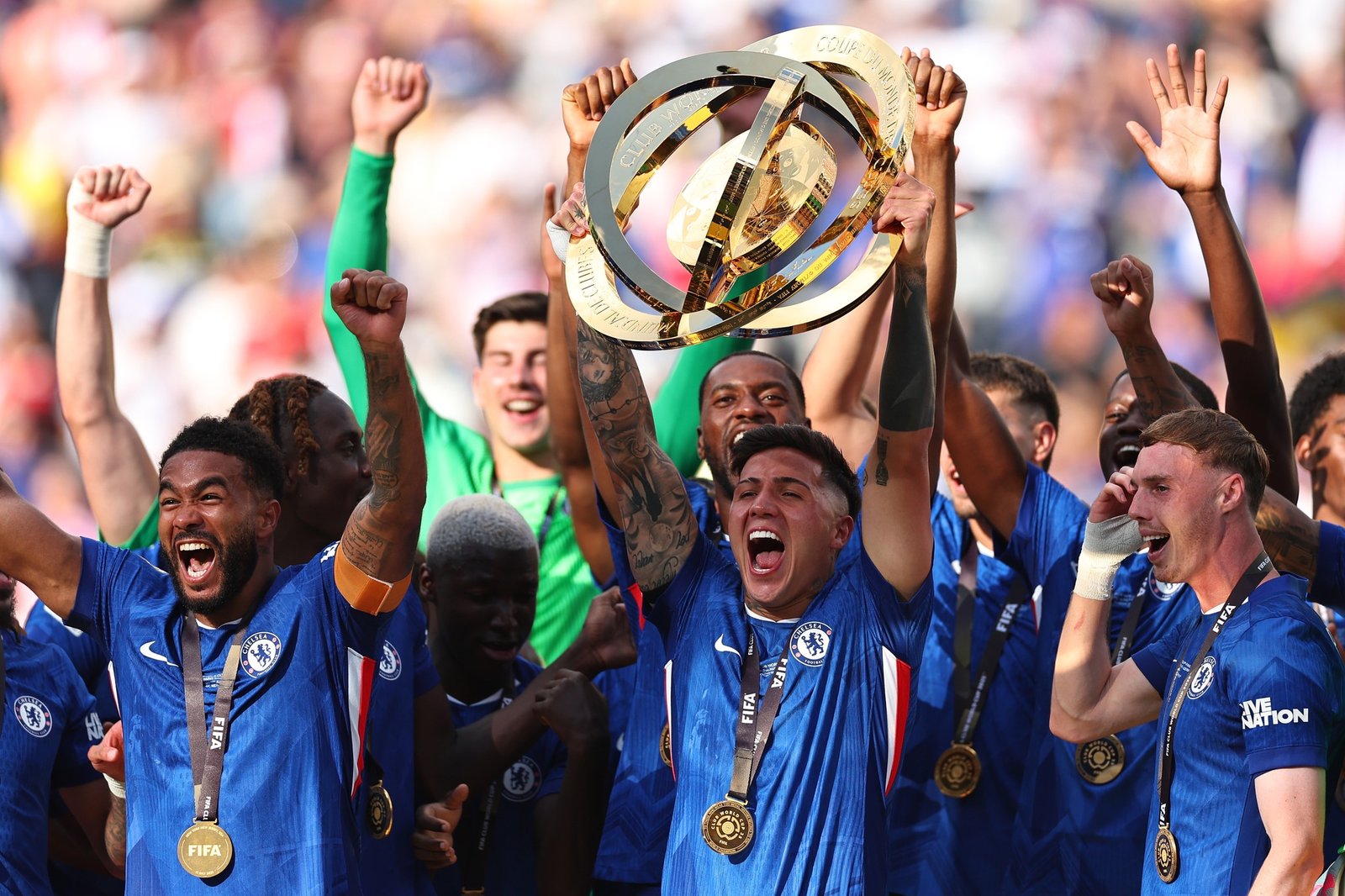 EAST RUTHERFORD, NEW JERSEY - JULY 13: Enzo Fernandez of Chelsea lifts the FIFA Club World Cup trophy and celebrates with team mates during the FIFA Club World Cup 2025 final match between Chelsea FC and Paris Saint-Germain at MetLife Stadium on July 13, 2025 in East Rutherford, United States. (Photo by Robbie Jay Barratt - AMA/Getty Images)