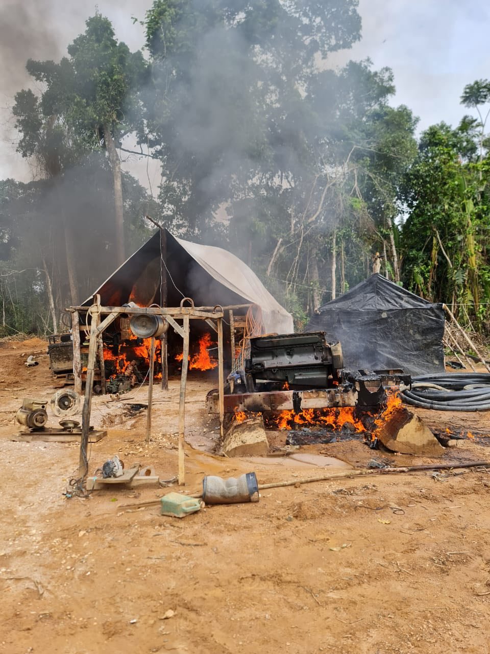 En la región se pudo evidenciar la explotación de oro aluvial a gran escala, con una afectación severa al suelo, la cobertura forestal y el ecosistema amazónico. Siguiendo los protocolos de ley, se procedió a la inutilización, destrucción y quema de la maquinaria pesada y las estructuras empleadas en el ilícito.