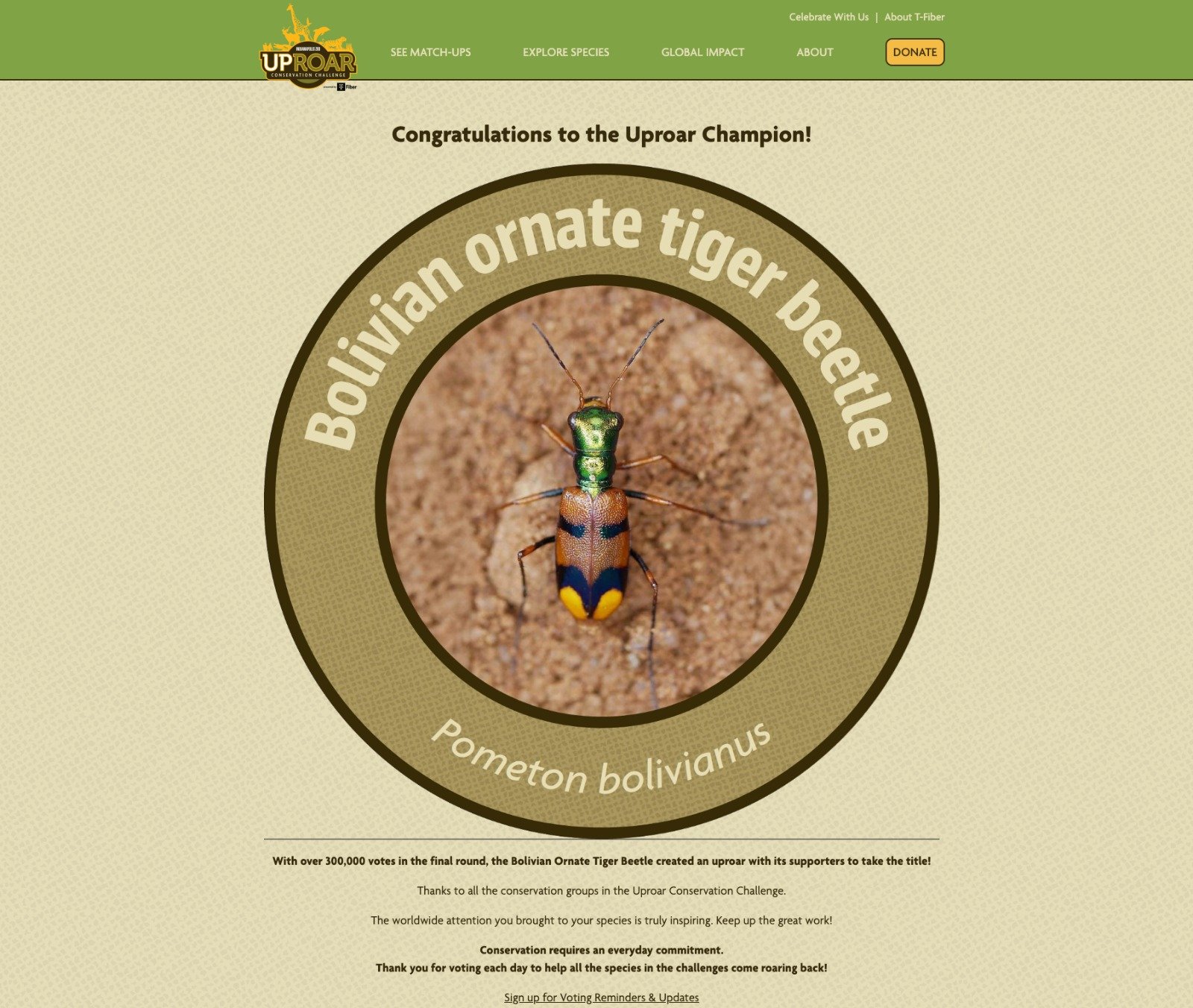 Obtuvo más de 300.000 votos en la ronda final, la especie boliviana “causó furor entre sus seguidores y se alzó con el título”. Fueron cuatro competidores que llegaron a la final y con los que el escarabajo tigre luchó fueron el tulipán silvestre de Kirguistán, marsopa vaquita y langur rayado de Raffles.