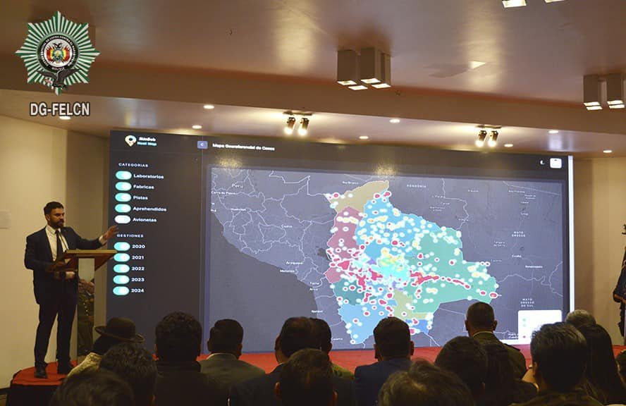 Además efectuó la explicación de un mapa con los sitios en donde se aprehendieron a más de 13 mil personas en los últimos cuatro años, todos relacionados con el narcotráfico, además de los lugares donde fueron secuestradas las 208 avionetas, junto a la ruta aérea del narcotráfico que va del norte de La Paz, transportado por Beni, el oriente boliviano y el sur de Bolivia.