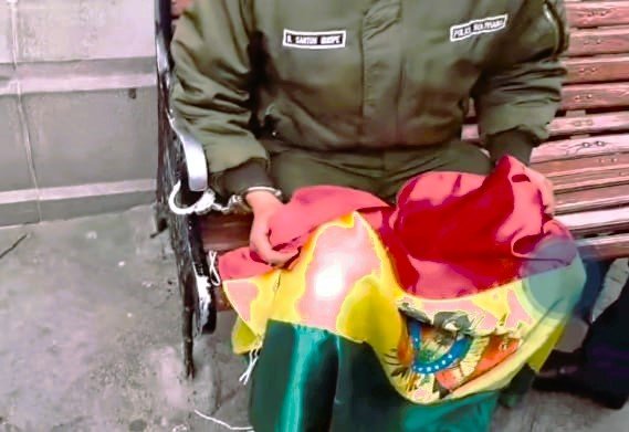 De manera inesperada el policía se enmanilló a una banca de la Plaza Murillo, donde expresó su molestia por la situación que atraviesa con un cambio de destino que le ordenaron hacia Pando, sobre el tema dijo que una “cúpula” cobra 300 dólares por la disposición de destinos en la entidad policial.