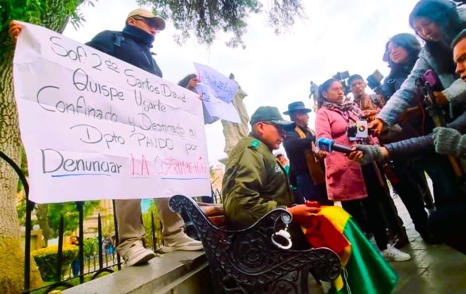 La Paz/IN EXTENSO.- Un suboficial de nombre Santos Quispe efectuó este jueves una protesta en la plaza Murillo y frente al legislativo, para denunciar el alto grado de corrupción en la entidad de los uniformado, especialmente en la designación de destinos, donde los generales y otros de alto grado se dedican a comercializar e incluso de las recaudaciones ilegales.