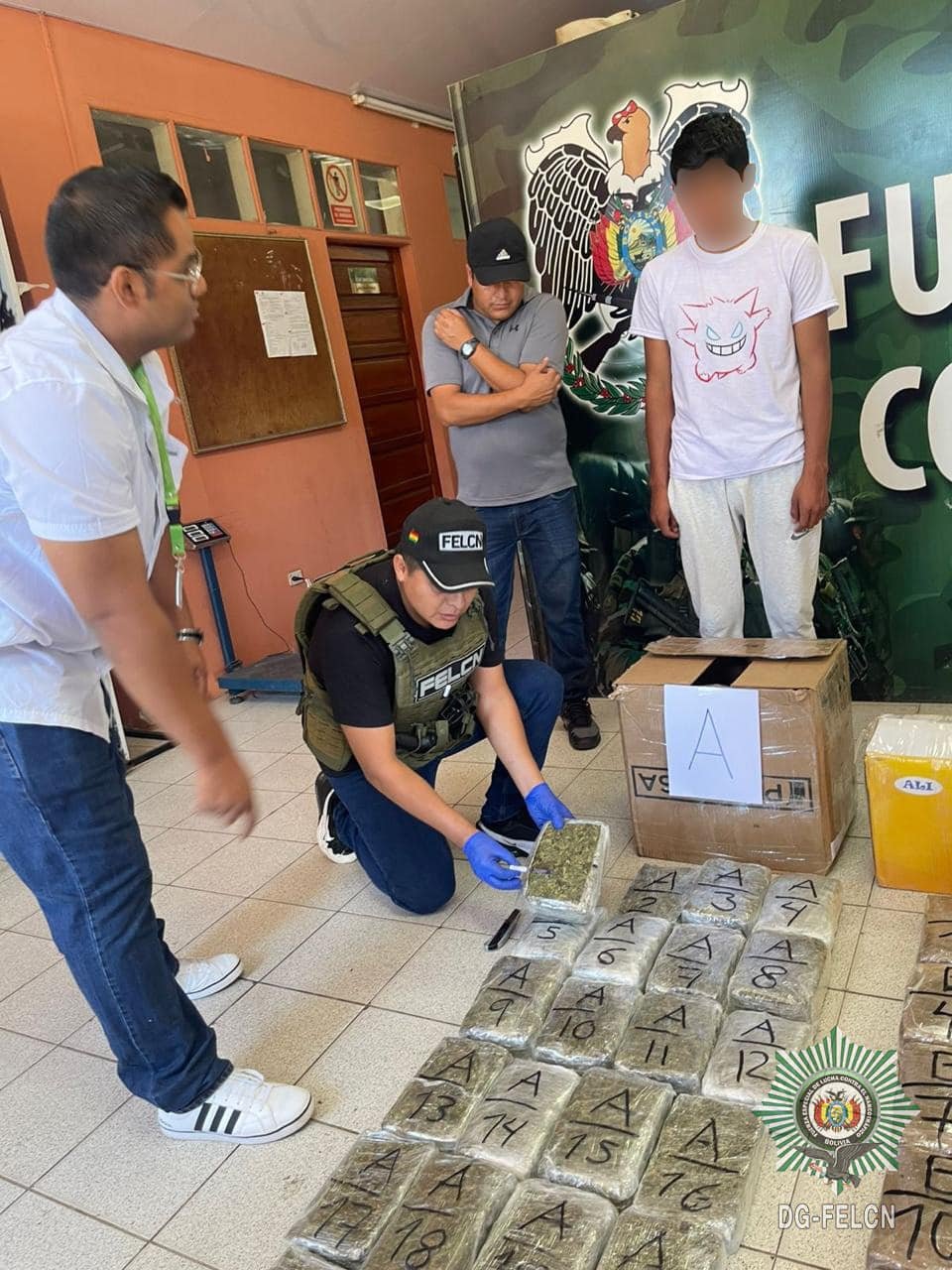 IN EXTENSO/Santa Cruz.- Aprehenden a dos sujetos, luego de ser sorprendidos viajando en un bus de transporte interdepartamental con 100 paquetes de marihuana. La droga estaba oculta en seis cajas de cartón que se encontraban en el guarda equipaje, el hecho sucedió, este jueves en Santa Cruz por agentes de la Fuerza Especial de Lucha Contra el Narcotráfico (Felcn).