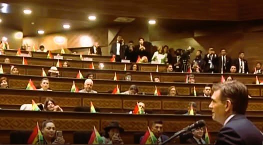 Tras el amuerzo, salió al balcón y desde ahí se dirigió a un grupo numeroso de personas que hacían ondear la tricolor y que esperaban su mensaje en plaza Murillo. Pidió disculpas por hacerlos esperar y les anunció que el lunes “empieza el duro trabajo”.