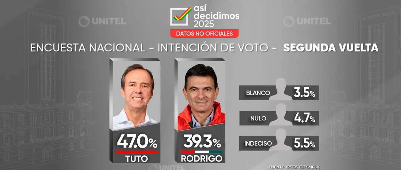 La Paz/IN EXTENSO.- Una primera encuesta realizada por el canal de Unitel, en una muestra que refleja que Rodrigo Paz y Tuto Quiroga disputan la Presidencia en la segunda vuelta electoral y definirá en el balotaje que definirá al próximo presidente de Bolivia,en la encuestra o muestre Quiroga alcanzó el 47% de la preferencia en la intención de voto, mientras Paz alcanzó el 39,3%. Es decir, el candidato de la Alianza Libre aventaja en 7,7% al postulante del PDC.